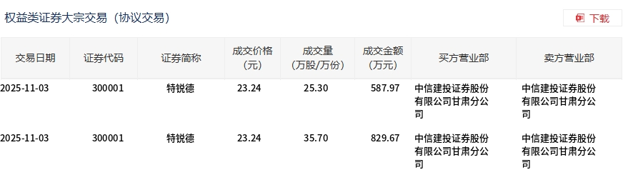11月3日,特锐德大宗交易成交61万股,成交额1417.64万元,占当日总成交额的1.08%,成交价23.24元,较市场收盘价29.17元折价20.33%。