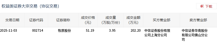牧原股份今日大宗交易平价成交3.95万股,成交额202.2万元