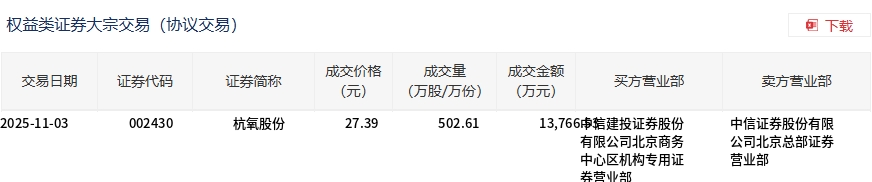 11月3日,杭氧股份大宗交易成交502.61万股,成交额1.38亿元,占当日总成交额的17.98%,成交价27.39元,较市场收盘价27.32元溢价0.26%。
