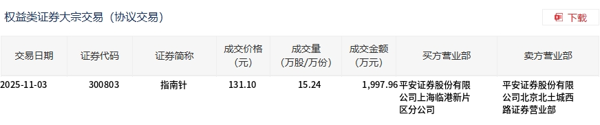 11月3日,指南针大宗交易成交15.24万股,成交额1997.96万元,占当日总成交额的0.79%,成交价131.1元,较市场收盘价144.3元折价9.15%。