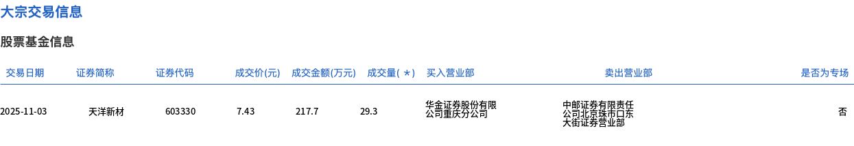 11月3日,天洋新材大宗交易成交29.3万股,成交额217.7万元,占当日总成交额的2.51%,成交价7.43元,较市场收盘价8.25元折价9.94%。