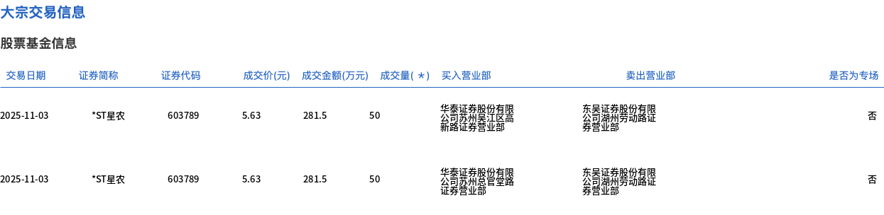 *ST星农今日大宗交易折价成交100万股,成交额563万元
