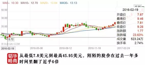与之对应的是,2016年至今的一年多时间里,陌陌的股价翻了近乎6倍:最低时7.8美元(2016年2月19日),最高时45.95美元(2017年5月26日),其总市值也一度突破80亿美元大关。