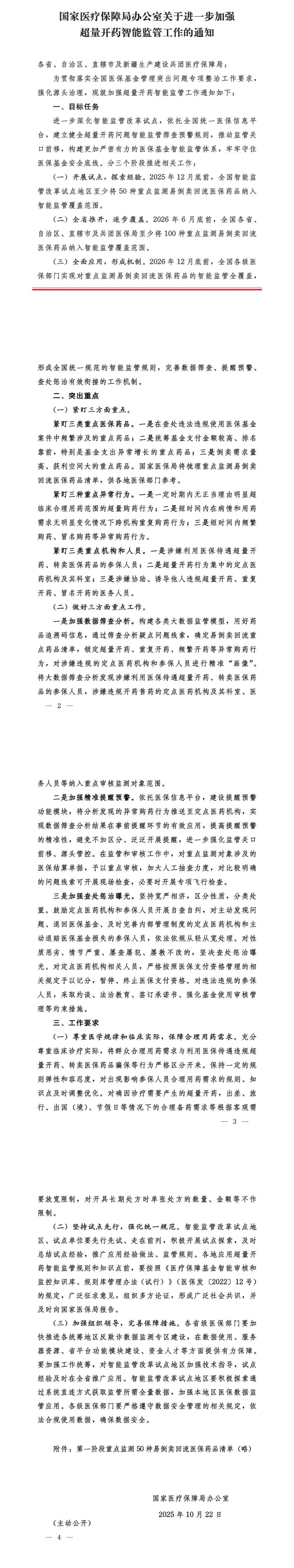 国家医保局日前发布通知,进一步加强超量开药智能监管工作。通知提出,2025年12月底前,全国智能监管改革试点地区至少将50种重点监测易倒卖回流医保药品纳入智能监管覆盖范围。2026年6月底前,全国各省、自治区、直辖市及兵团医保局至少将100种重点监测易倒卖回流医保药品纳入智能监管覆盖范围。2026年12月底前,全国各级医保部门实现对重点监测易倒卖回流医保药品的智能监管全覆盖,形成全国统一规范的智能监管规则,完善数据筛查、提醒预警、查处惩治有效街接的工作机制。