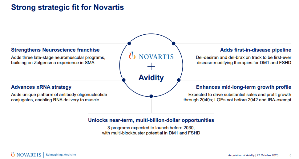 Zolgensma基因疗法支撑了诺华多年的罕见病收入,但专利悬崖在即,公司急需新的增长引擎,而Avidity在神经肌肉疾病领域的布局恰好能补上这块空白。正如诺华表示:“Avidity的管线与我们在罕见神经肌肉领域的商业布局高度协同。”