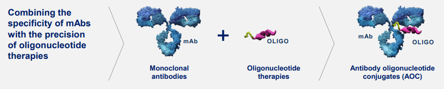 随着多款ADC药物的成功上市,以ADC为基础的新兴药物偶联模式的研发正在迅速展开。而AOC(Antibody-Oligonucleotide Conjugate)抗体-寡核苷酸偶联物,则利用了ADC的设计思路,将RNA疗法与抗体药物的靶向递送结合起来,用抗体“引路”,让小核酸药物精准送达目标组织。