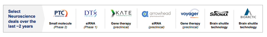 在del-desiran有望上岸前出手,既踩准Avidity的价值,也能立刻强化自身RNA布局。过去两年,诺华通过多笔交易布局了神经科学小分子、基因疗法和血脑屏障技术,如今AOC再一次填补了诺华RNA疗法布局,从siRNA到ASO再到AOC、从肝脏到肌肉、再到中枢,形成了独特的核酸药物体系(RNAx)。