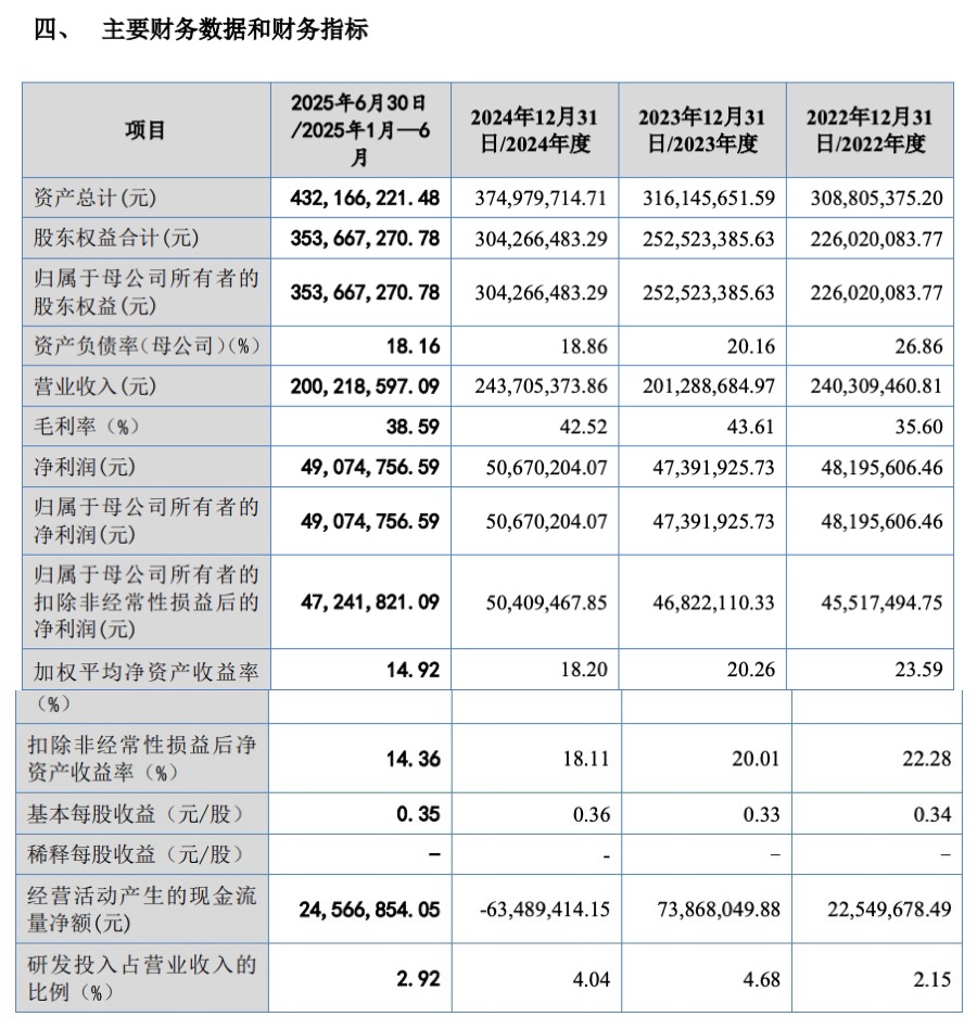 从更长周期观察,2022年至2024年,公司营业收入从2.4亿元波动增长至2.44亿元,归母净利润保持在4800万元至5100万元区间。
