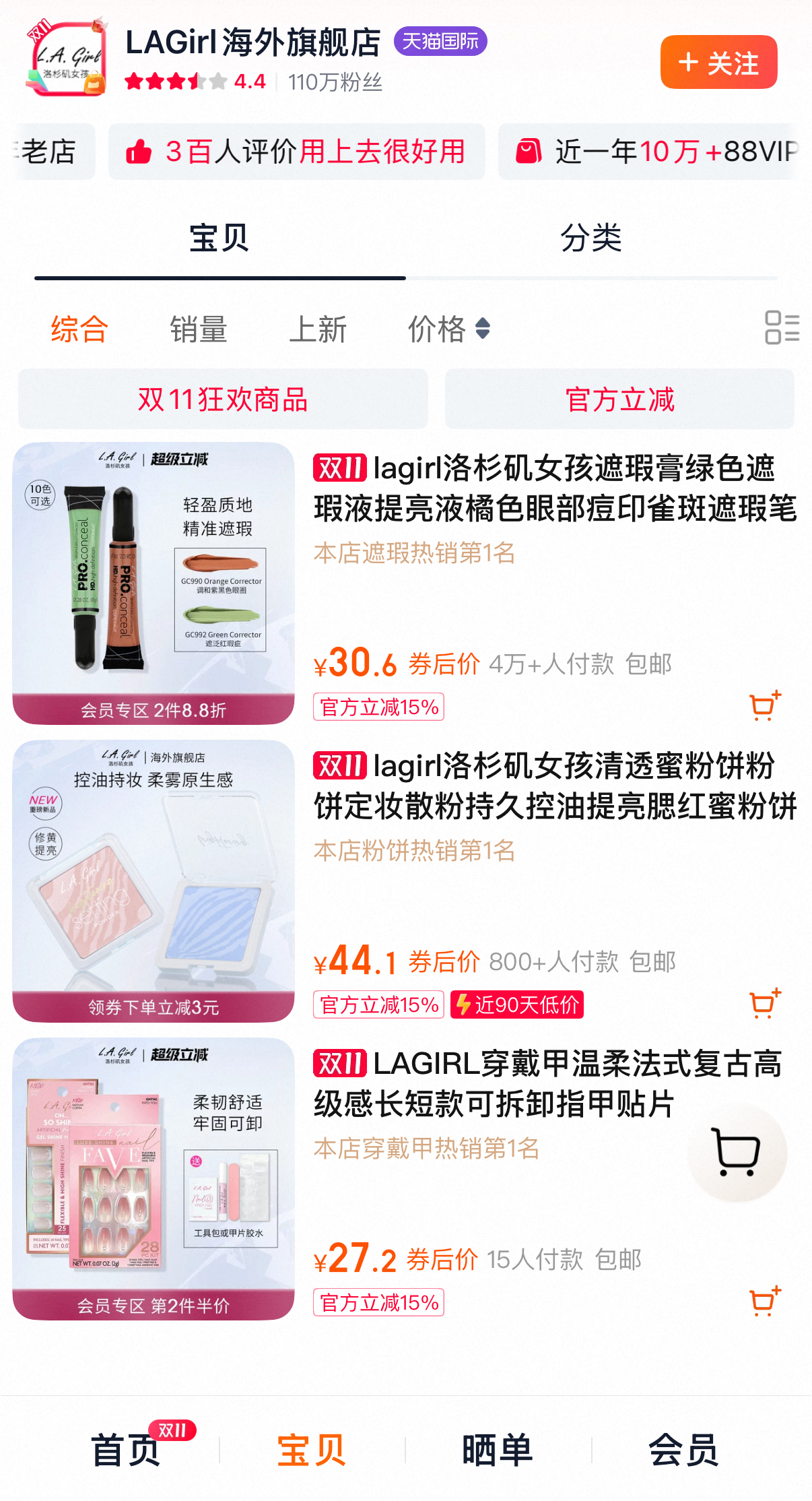 截至目前,店内仅剩3款产品在售,包括遮瑕膏、蜜粉饼和穿戴甲,分别显示已售5万+件、1000+件、22件,其余商品全部下架;店铺粉丝数达110万人。