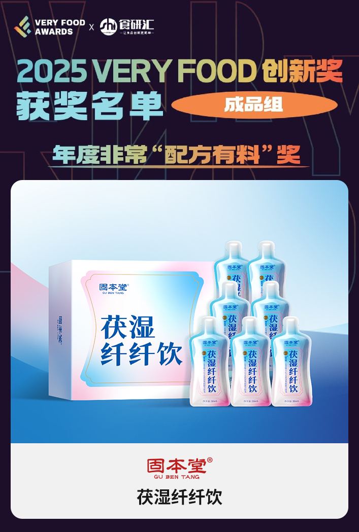 2025年10月,由食研汇FTA主办的 2025 Very Food 创新奖评选正式揭晓,山东固本堂健康产业开发集团股份有限公司旗下茯湿纤纤饮凭借硬核产品力,在173件成品组入围作品中突围,成功摘得年度非常“配方有料”奖。该赛事主要为对食品行业中做出重大贡献、取得巨大成就的上游原料、终端产品和科研创新成果等等进行评选和表彰。