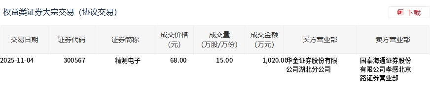 11月4日,精测电子大宗交易成交15万股,成交额1020万元,占当日总成交额的3.3%,成交价68元,较市场收盘价73.88元折价7.96%。