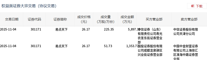 11月4日,易点天下大宗交易成交277.08万股,成交额7251.09万元,占当日总成交额的9.86%,成交价26.17元,较市场收盘价31.06元折价15.74%。