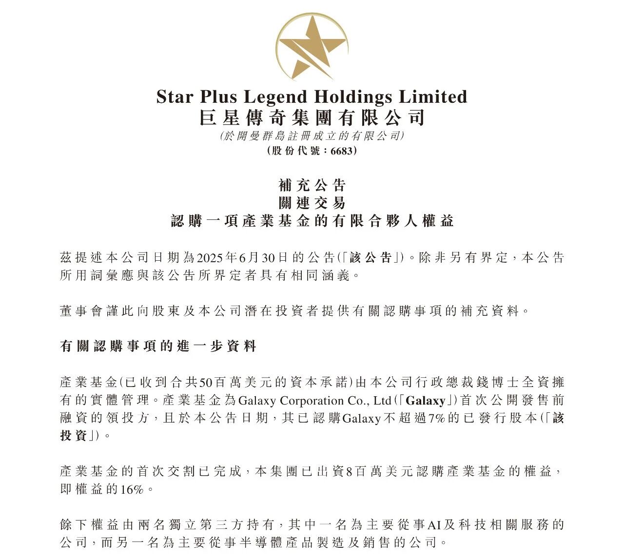 巨星传奇表示,该投资预期将为公司与Galaxy带来多方面的协同效益,目前双方正就策略性合作的细节进行深入讨论,合作范畴包括但不限于与Galaxy艺人合作举办展览、演唱会、艺人IP及相关周边开发等。