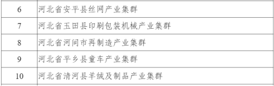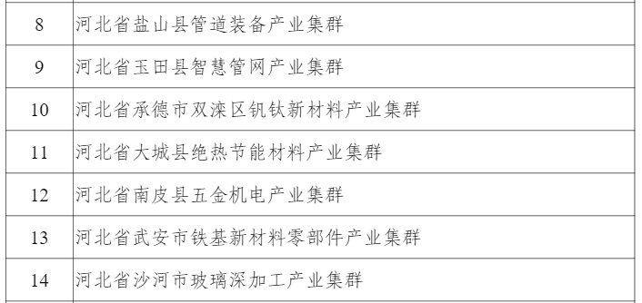 河北入围的7个集群分别是河北省盐山县管道装备产业集群、河北省玉田县智慧管网产业集群、河北省承德市双滦区钒钛新材料产业集群、河北省大城县绝热节能材料产业集群、河北省南皮县五金机电产业集群、河北省武安市铁基新材料零部件产业集群、河北省沙河市玻璃深加工产业集群。