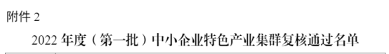 同时,工信部还发布了2022年度(第一批)中小企业特色产业集群复核通过名单。河北省安平县丝网产业集群、河北省玉田县印刷包装机械产业集群、河北省河间市再制造产业集群、河北省平乡县童车产业集群、河北省清河县羊绒及制品产业集群等5个产业集群通过复核。