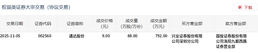 11月5日,通达股份大宗交易成交88万股,成交额792万元,占当日总成交额的1.66%,成交价9元,较市场收盘价9.13元折价1.42%。