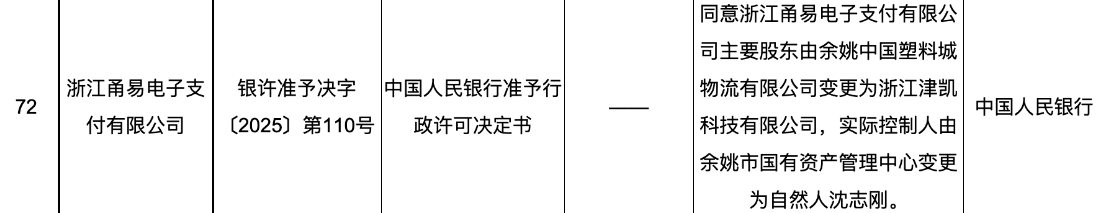 近日,根据央行官网公示,甬易支付主要股东由余姚中国塑料城物流有限公司变更为浙江津凯科技有限公司(以下简称“津凯科技”),实际控制人正式由余姚市国有资产管理中心,变更为正凯集团董事长沈志刚。这标志着,甬易支付所有权已从地方国企流转至民营产业巨头之手。