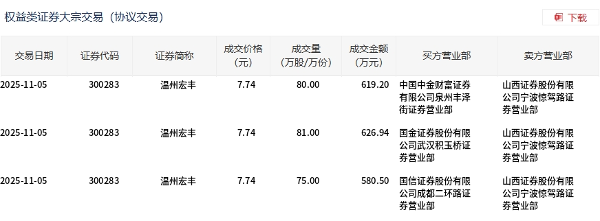 11月5日,温州宏丰大宗交易成交236万股,成交额1826.64万元,占当日总成交额的5.13%,成交价7.74元,较市场收盘价7.9元折价2.03%。