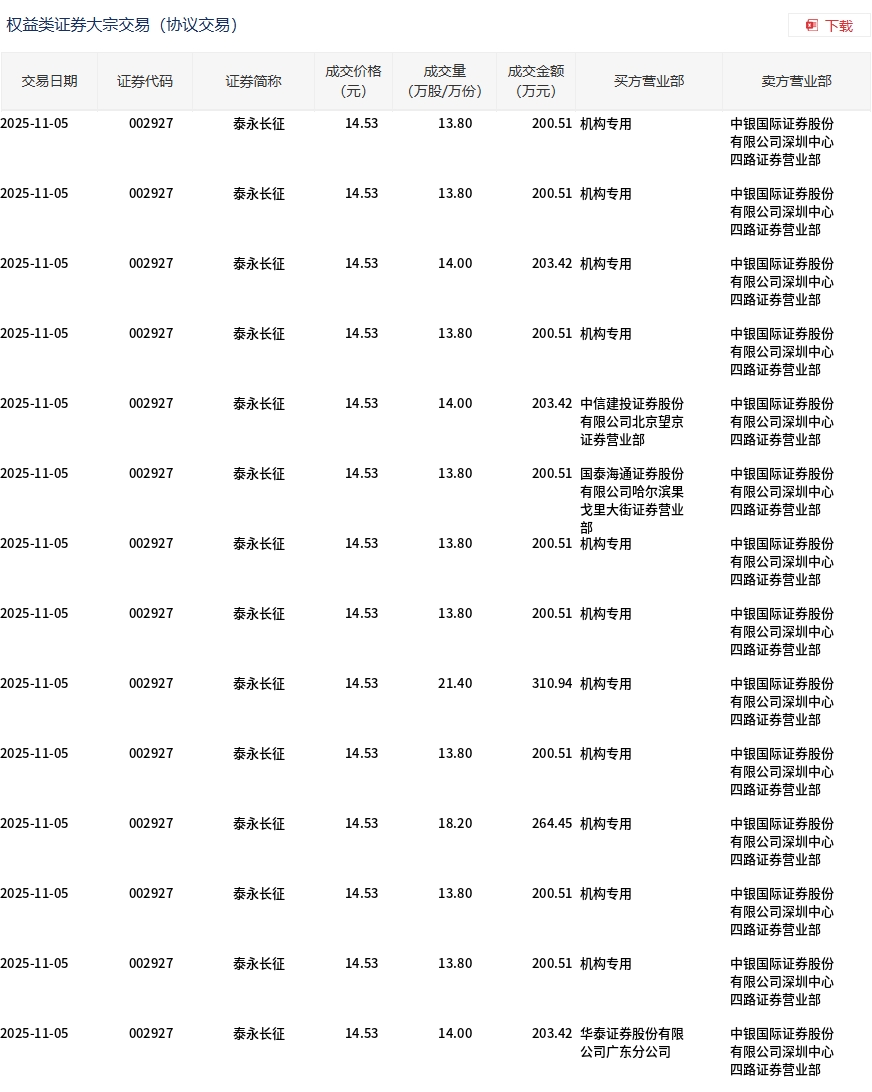 11月5日,泰永长征大宗交易成交205.8万股,成交额2990.24万元,占当日总成交额的8.93%,成交价14.53元,较市场收盘价16.55元折价12.21%。