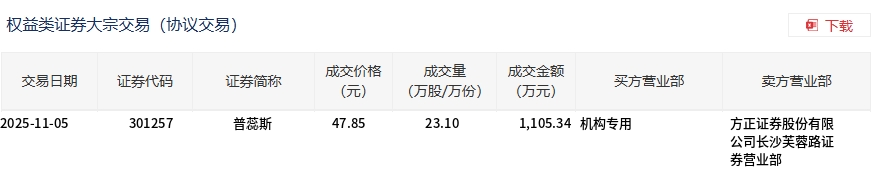 11月5日,普蕊斯大宗交易成交23.1万股,成交额1105.34万元,占当日总成交额的10.55%,成交价47.85元,较市场收盘价48.83元折价2.01%。