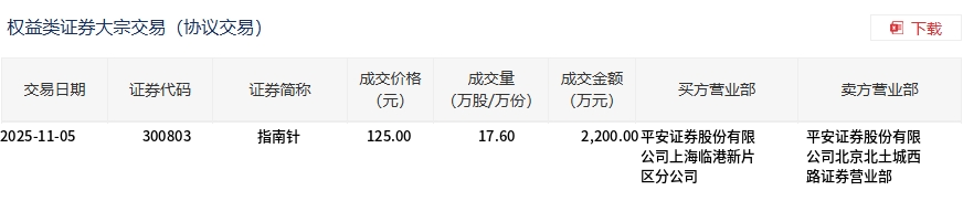 11月5日,指南针大宗交易成交17.6万股,成交额2200万元,占当日总成交额的0.78%,成交价125元,较市场收盘价136.03元折价8.11%。
