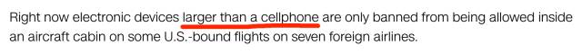 而这项禁令公布很可能是和恐怖分子有关,凯利解释道,在航空领域存在着“大量威胁”,恐怖分子费尽心思想要袭击飞机,尤其关注坐着美国乘客的飞机。4月就曾报道恐怖分子已经研发出能成功蒙混过部分机场安检系统的新手段——将爆炸物填充到电子设备内部。因此禁止携带电脑上飞机成了反恐怖组织努力的一部分。