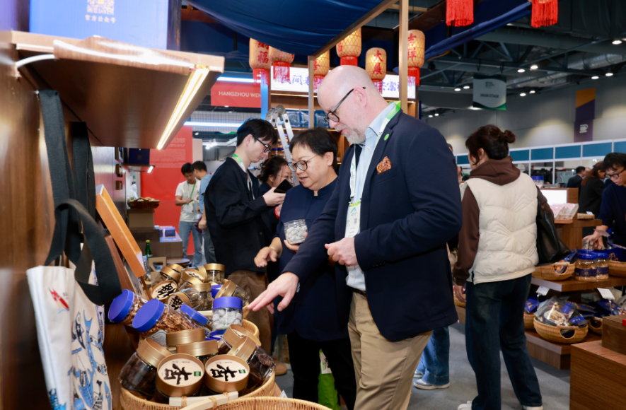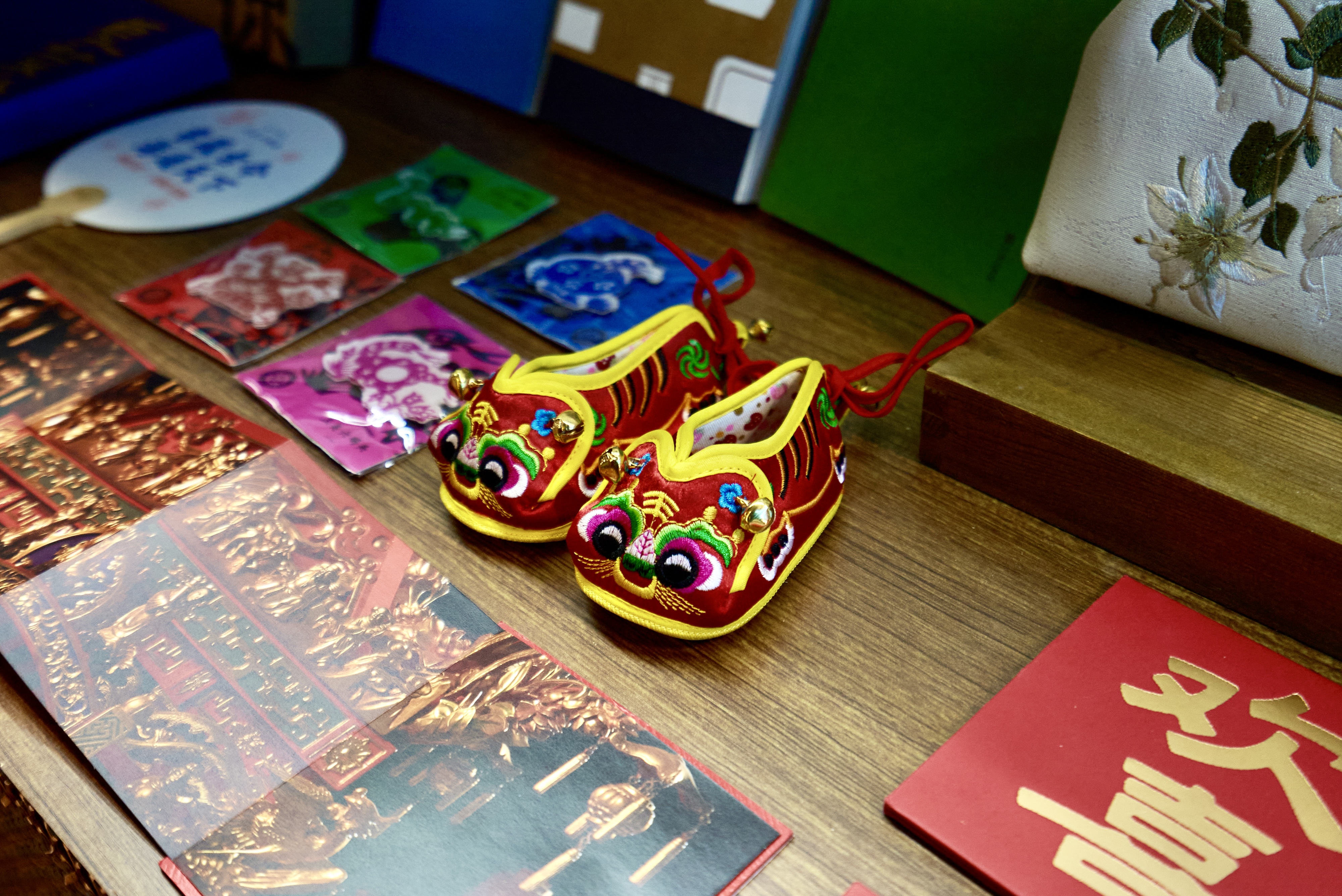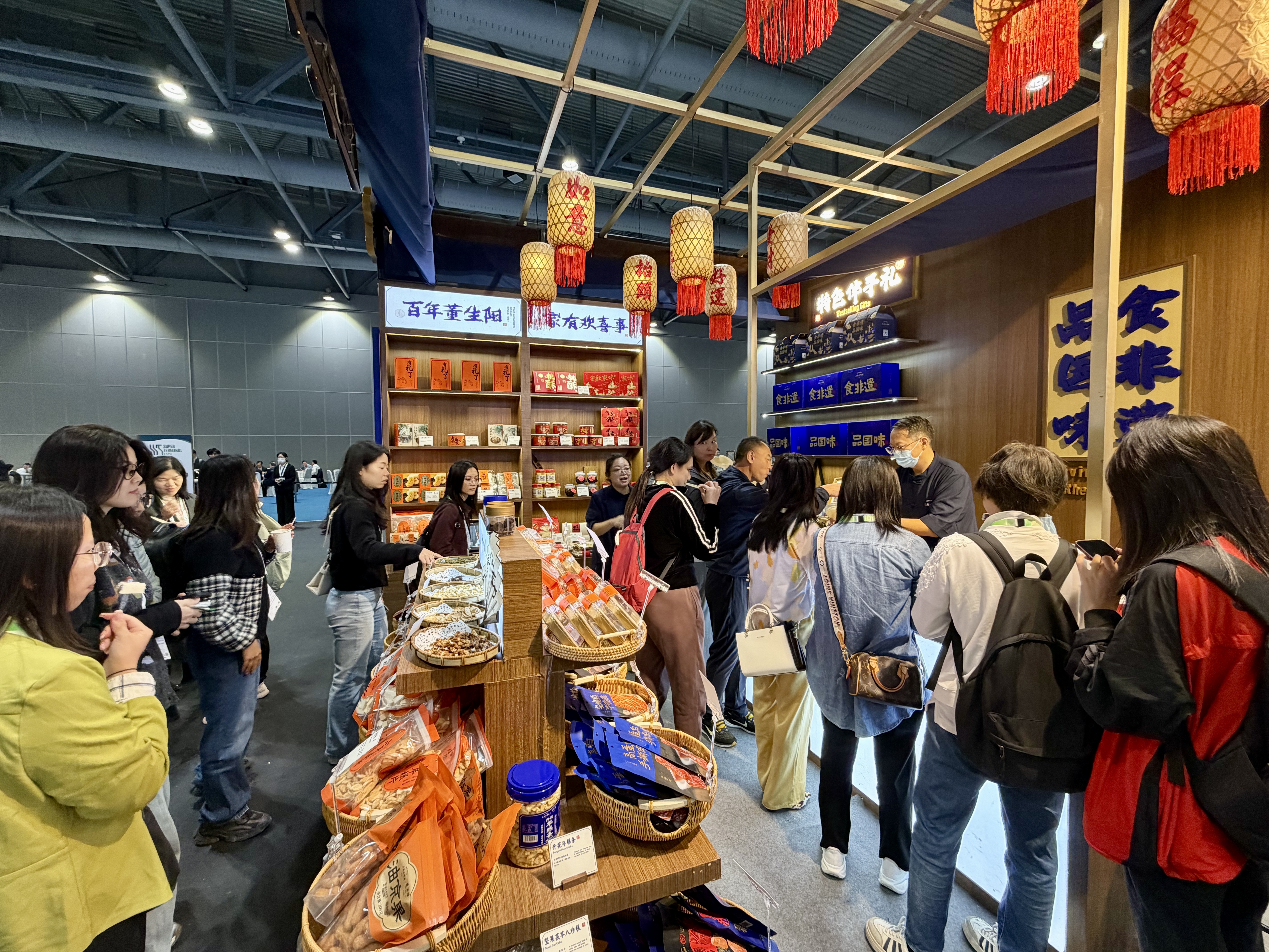 此次参展,三关六码头的展台堪称“镇海文化缩影”——不仅带来“董生阳”系列特色糕点与本土优质农产品,更搭建起镇海“飞遗station”微展陈。展柜内,手工针刺口金包排列整齐、做工精巧;以红色绸缎为底的虎头鞋格外吸睛,黄色绒线勾勒出灵动的虎头造型;蛇年限定冰箱贴、剪纸书签等文创产品错落摆放。这些带着温度的非遗展品,引得参观者纷纷驻足,不少海外客商一边拍照记录,一边向工作人员追问针刺工艺的传承历史,沉浸式感受镇海文化的独特魅力。
