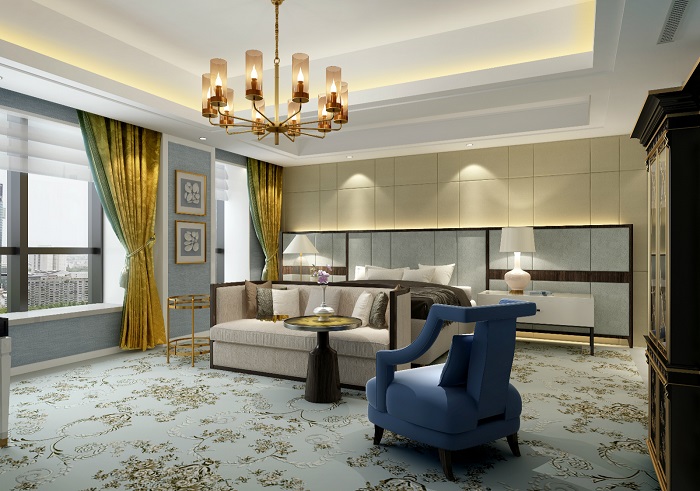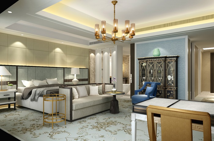 总共 491 间客房,其中有 66 间套房和 55 间公寓,全部分布在嘉地中心 36-68 层,所有房间都有很好的观景角度。客房内饰是奢华古典英伦风与现代简约风相结合,宫廷式的枝形吊灯、碎花地毯以及古典壁柜与线条简洁的衣橱、床头灯以及洁白的独立浴缸相结合,并配上 48 英寸的液晶纯平电视、易用型电源插座等高科技设施,在舒适度之外又增添了便利性。