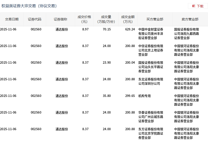 11月6日,通达股份大宗交易成交225.85万股,成交额1932.45万元,占当日总成交额的5.06%,成交均价8.56元,较市场收盘价9.1元折价5.97%,其中最高成交价8.97元,最低成交价8.37元。