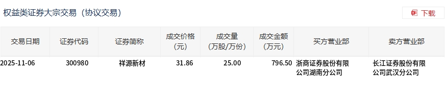 11月6日,祥源新材大宗交易成交25万股,成交额796.5万元,占当日总成交额的1.52%,成交价31.86元,较市场收盘价32.35元折价1.51%。