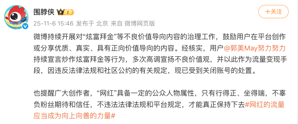 微博官方账号@围脖侠 发文称,微博持续开展对“炫富拜金”等不良价值导向内容的治理工作,鼓励用户在平台创作或分享优质、真实、具有正向价值导向的内容。经核实,用户@郭美May努力努力 持续炒作炫富拜金等行为,多次高调宣扬不良价值观,并以此作为流量变现手段,因违反法律法规和社区公约的有关规定,现已受到关闭账号的处置。提醒广大创作者,“网红”具备一定的公众人物属性,只有行得正、坐得端,不辜负粉丝期待和信任,不违法法律法规和平台规定,才能真正保持下去。