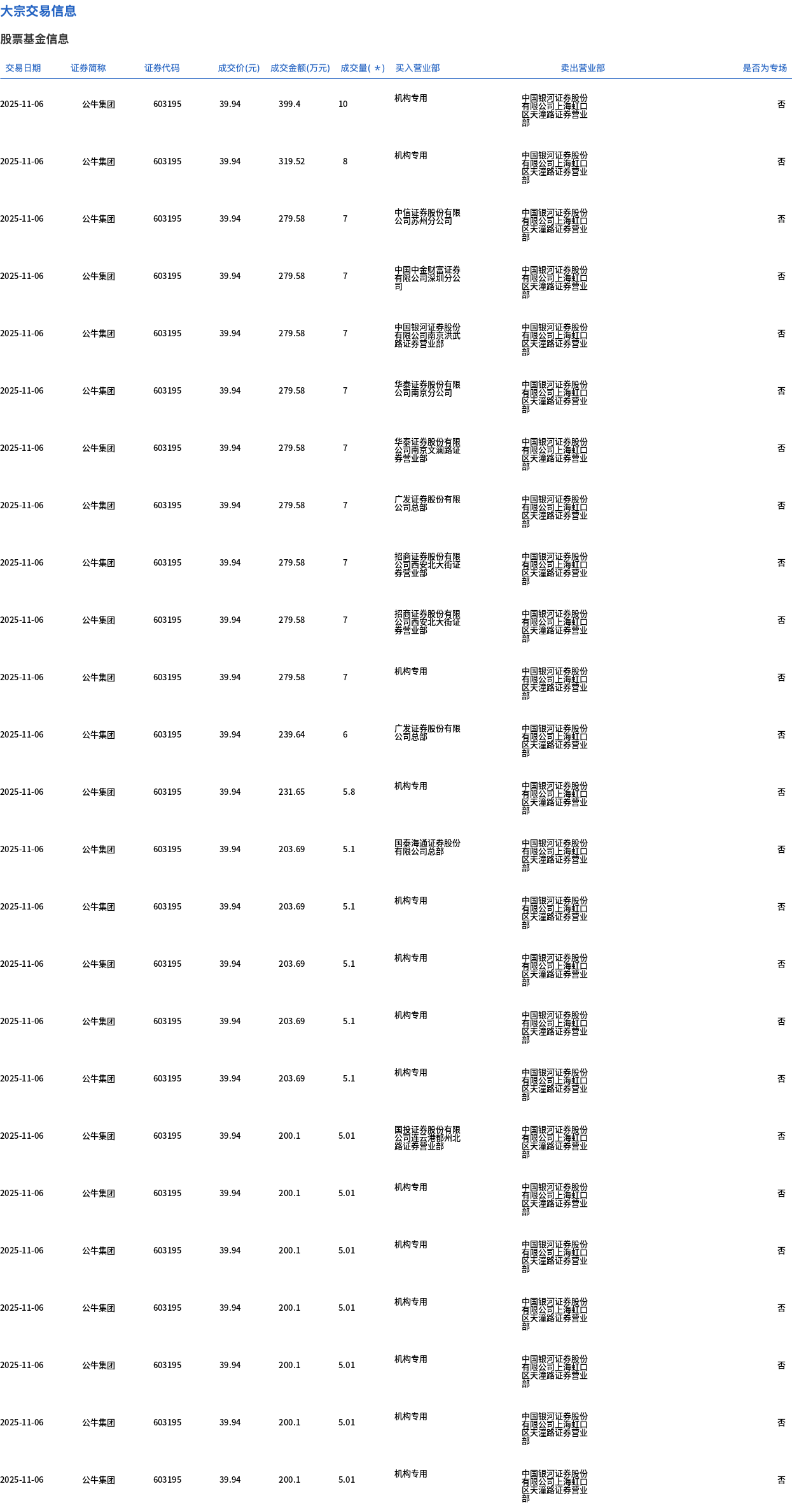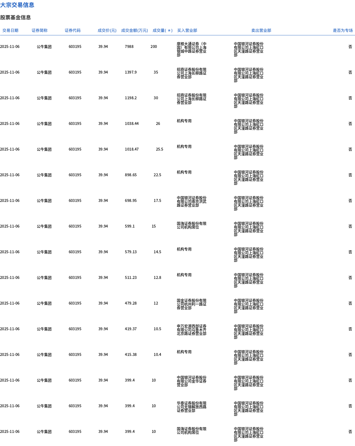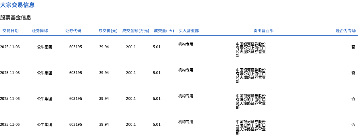 11月6日,公牛集团大宗交易成交635.11万股,成交额2.54亿元,占当日总成交额的51.26%,成交价39.94元,较市场收盘价43.75元折价8.71%。