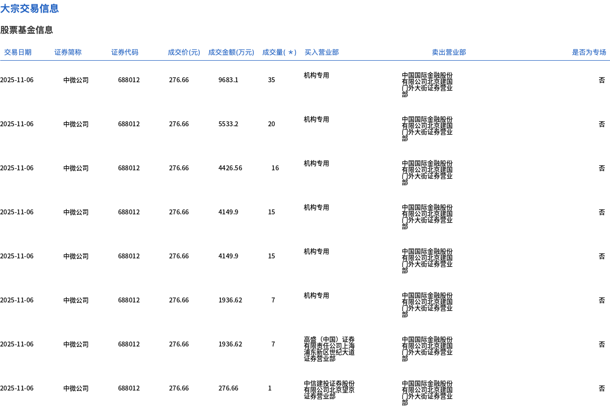11月6日,中微公司大宗交易成交116万股,成交额3.21亿元,占当日总成交额的5.22%,成交价276.66元,较市场收盘价306元折价9.59%。