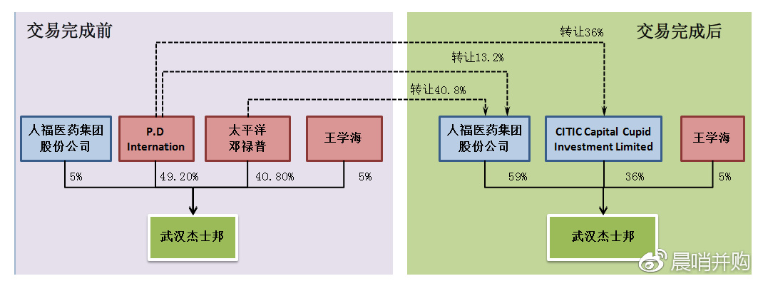 国内,人福医药联合 CITIC Capital Cupid Investment Limited共同收购杰士邦旗下武汉杰士邦卫生用品有限公司90%的股份,其中,人福医药以1.2亿美元收购杰士邦公司54%的股权,CITIC Capital Cupid Investment Limited以0.8亿美元收购杰士邦公司36%的股权。由于此前人福医药及其董事长王学海已经持有武汉杰士邦5%的股份,收购后,人福医药的持股比例达到59%。