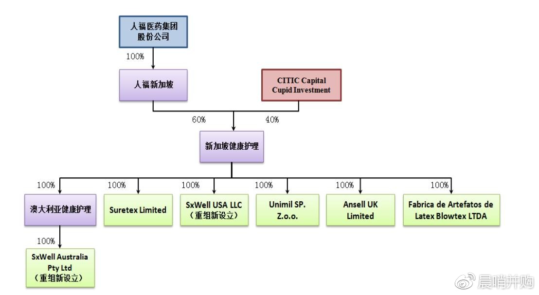 国外,人福医药全资子公司RFSW Investment Pte. Ltd.(以下简称“人福新加坡”)与CITIC Capital Cupid Investment Limited共同设立合资企业RFSW Management Pte. Ltd.(以下简称“新加坡健康护理”)。人福新加坡出资不超过1.2亿美元,持股新加坡健康护理的比例为60%,CITIC Capital Cupid Investment Limited配比现金出资,持股新加坡健康护理的比例为40%。新加坡健康护理以4亿美元收购Ansell Ltd.下属全球(除中国外)两性健康业务全部6家子公司100%的股权。