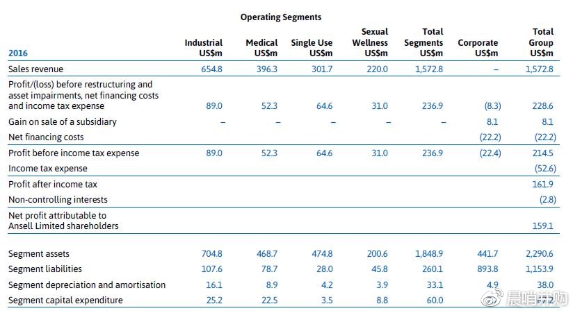 Ansell是世界知名的劳保用品和避孕套生产商,其前身是1899年成立的邓禄普。Ansell旗下包含了Industrial, Medical, Single Use 和Sexual Wellness四个事业部,2016年总计营业收入15.73亿美元,EBIT2.37亿美元,净利润1.59亿美元。