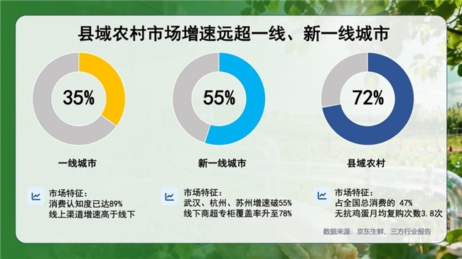 更令人惊喜的是县域市场的表现。京东数据显示,2024年县域农村无抗食品的市场增速达72%,远超一线城市。这类消费者愿意为“适度健康溢价”买单,无抗鸡蛋的月均复购次数达3.8次,显示出下沉市场对高品质健康食品的旺盛需求。