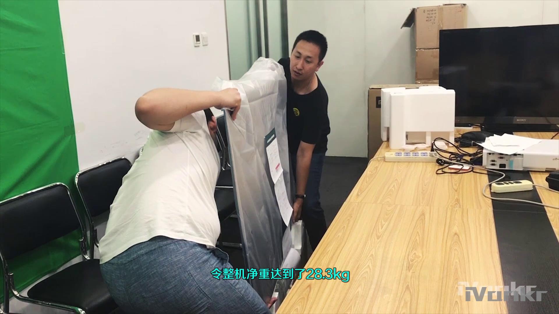 而看似超薄的机身,在合金中框和金属背板的加持下,令整机净重达到了28.3kg,再加上尺寸比较大,所以初次开箱安装时,基本一个人很难搞定。