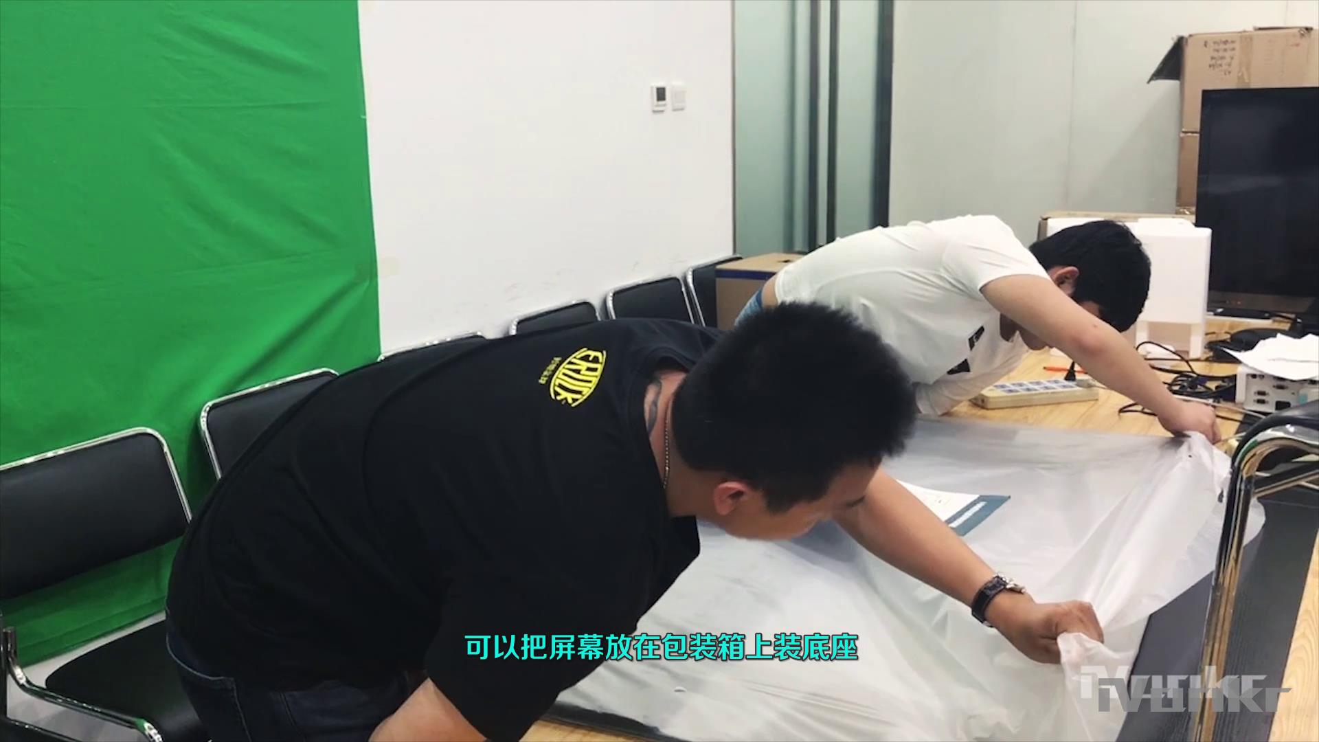 注意,由于电视面板非常薄,搬运、装底座的时候要格外小心,如果没有图中这么大的桌子,考拉给你支个招,可以把屏幕放在包装箱上装底座。