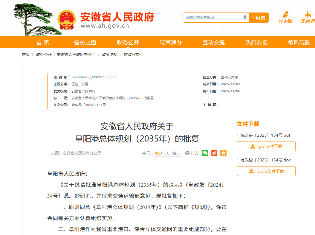 11月6日,安徽省人民政府网站发布安徽省人民政府关于阜阳港总体规划(2035年)的批复。