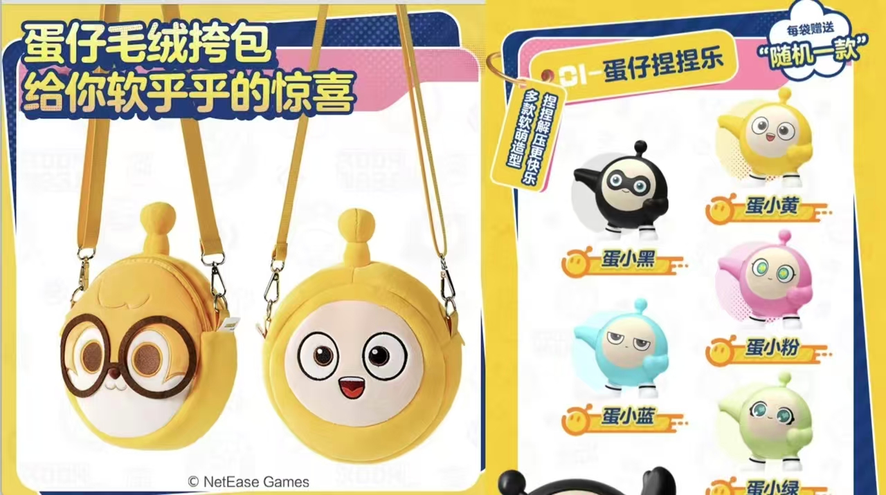在去年年末至今年年初开启的三只松鼠与《蛋仔派对》的IP联动,推出四款定制化零食礼包,以超大分量零食搭配可爱IP玩具实现破圈。其中附赠IP毛绒挎包,正面是蛋仔,反面是松鼠,实用性与可爱值拉满,还有软萌蛋仔捏捏乐,随机角色,圆滚滚的造型精准契合年轻群体的解压需求。