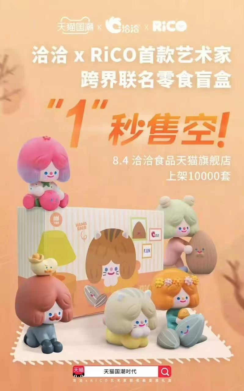 以洽洽食品为例,其早在2020年8月便与潮玩IP寻找独角兽RiCO展开跨界联动,推出限量一万份的联名零食盲盒。礼盒内不仅集结了洽洽旗下多款热销炒货,更搭配了RiCO专属联动盲盒,实现美味与颜值的双重赋能。该合作在官宣阶段就引发各圈层KOL的热烈讨论,发售当天一万套礼盒瞬间售罄,一度出现一“娃”难求的火爆盛况。