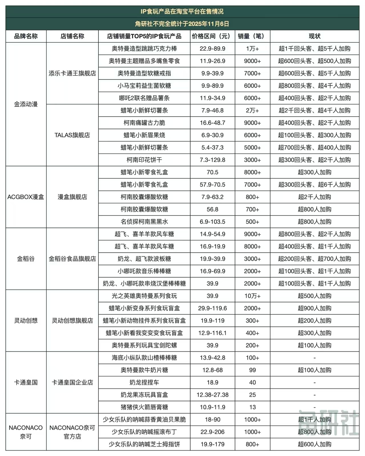 角研社整理了6个IP食玩品牌,目前在淘宝官店仍在售的销量TOP5产品,及其价格区间、销量、回购情况等。