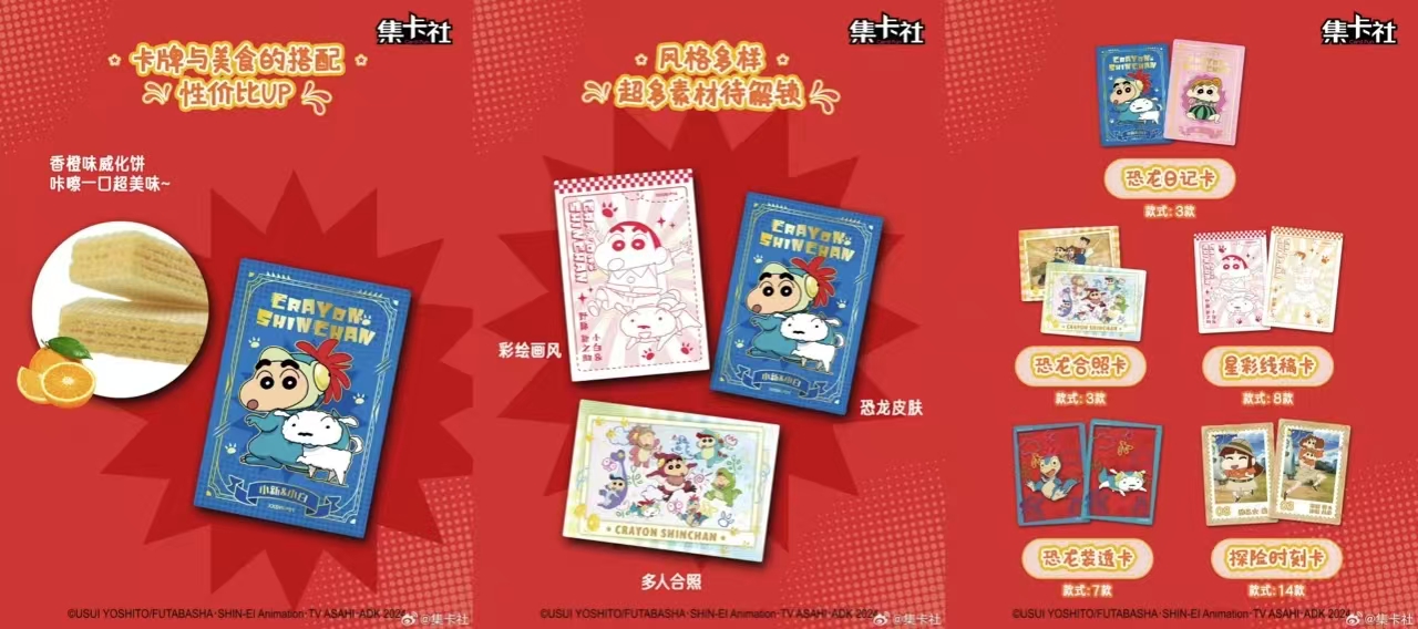 强收藏性玩具主要是徽章、卡牌、冰箱贴、摆件等,例如集卡社与《蜡笔小新:我们的恐龙日记》合作推出的“威化饼干+IP卡牌”的食玩组合,一共设计了三十多张卡牌,五个系列,每个系列的做工、内容都有所差异,但精美度很高,极具收藏价值。