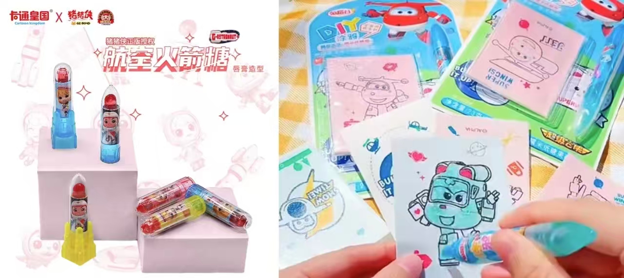 一种是将IP元素融入零食中,而零食本身就具有玩具属性。例如,卡通皇国获得《猪猪侠》授权后推出的火箭唇膏糖,或是金稻谷推出的超级飞侠款DIY糯米纸涂鸦糖果,可以用果冻糖果在糯米纸上画出超级飞侠角色图案。