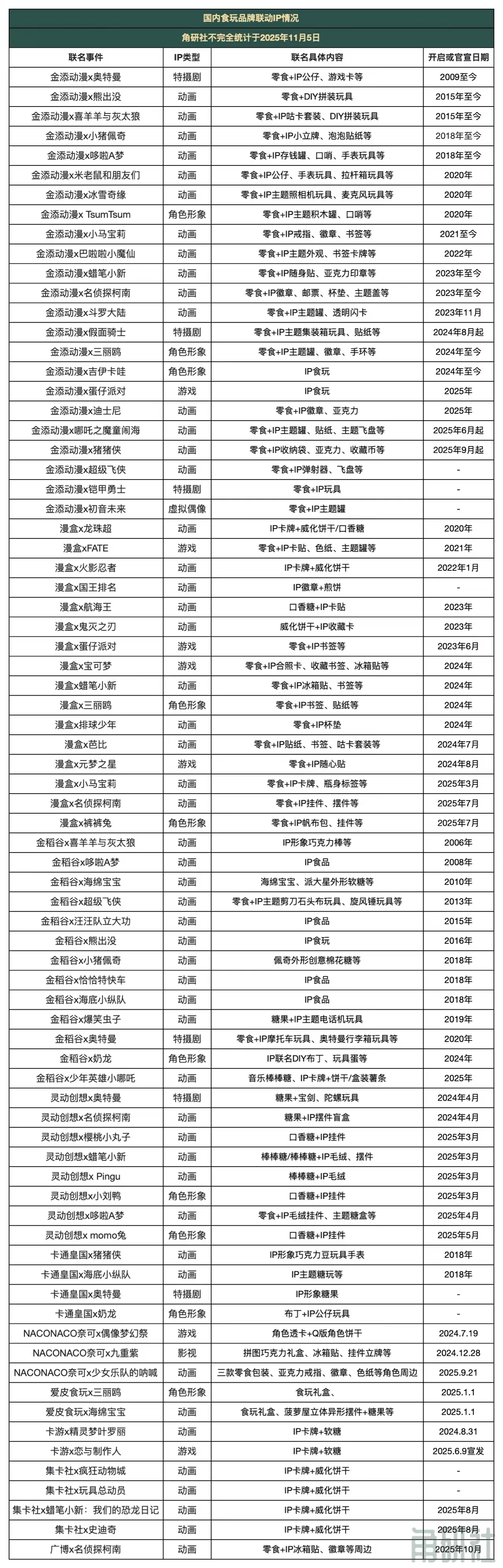 为了更清晰的了解国内IP食玩的整体情况,角研社在这里整理了10个从事IP食玩的本土企业,及其与50个IP联动的76起IP食玩合作事件,如下: