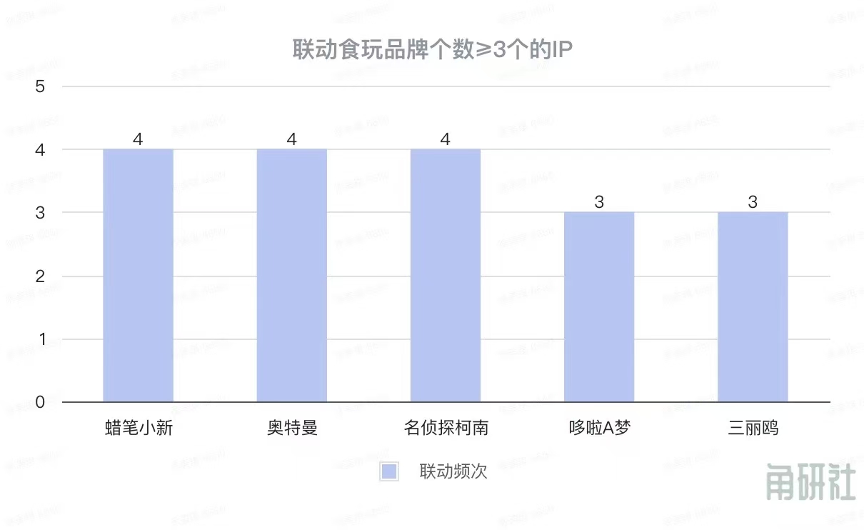 其中,不少IP重复出现多次,联动食玩品牌个数超过或达到三个的就有5个IP,分别是蜡笔小新、奥特曼、哆啦A梦、名侦探柯南、三丽鸥。