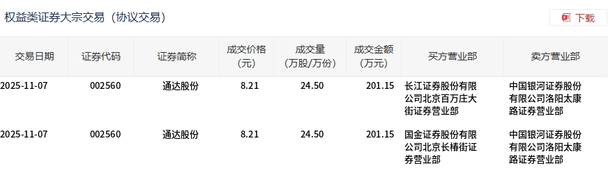 11月7日,通达股份大宗交易成交49万股,成交额402.3万元,占当日总成交额的1.47%,成交价8.21元,较市场收盘价9.02元折价8.98%。