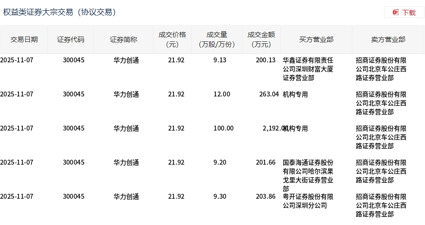 11月7日,华力创通大宗交易成交139.63万股,成交额3060.69万元,占当日总成交额的2.9%,成交价21.92元,较市场收盘价24.13元折价9.16%。