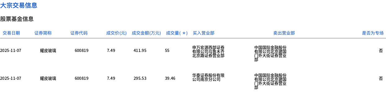 11月7日,耀皮玻璃大宗交易成交94.46万股,成交额707.48万元,占当日总成交额的2.8%,成交价7.49元,较市场收盘价8.51元折价11.99%。